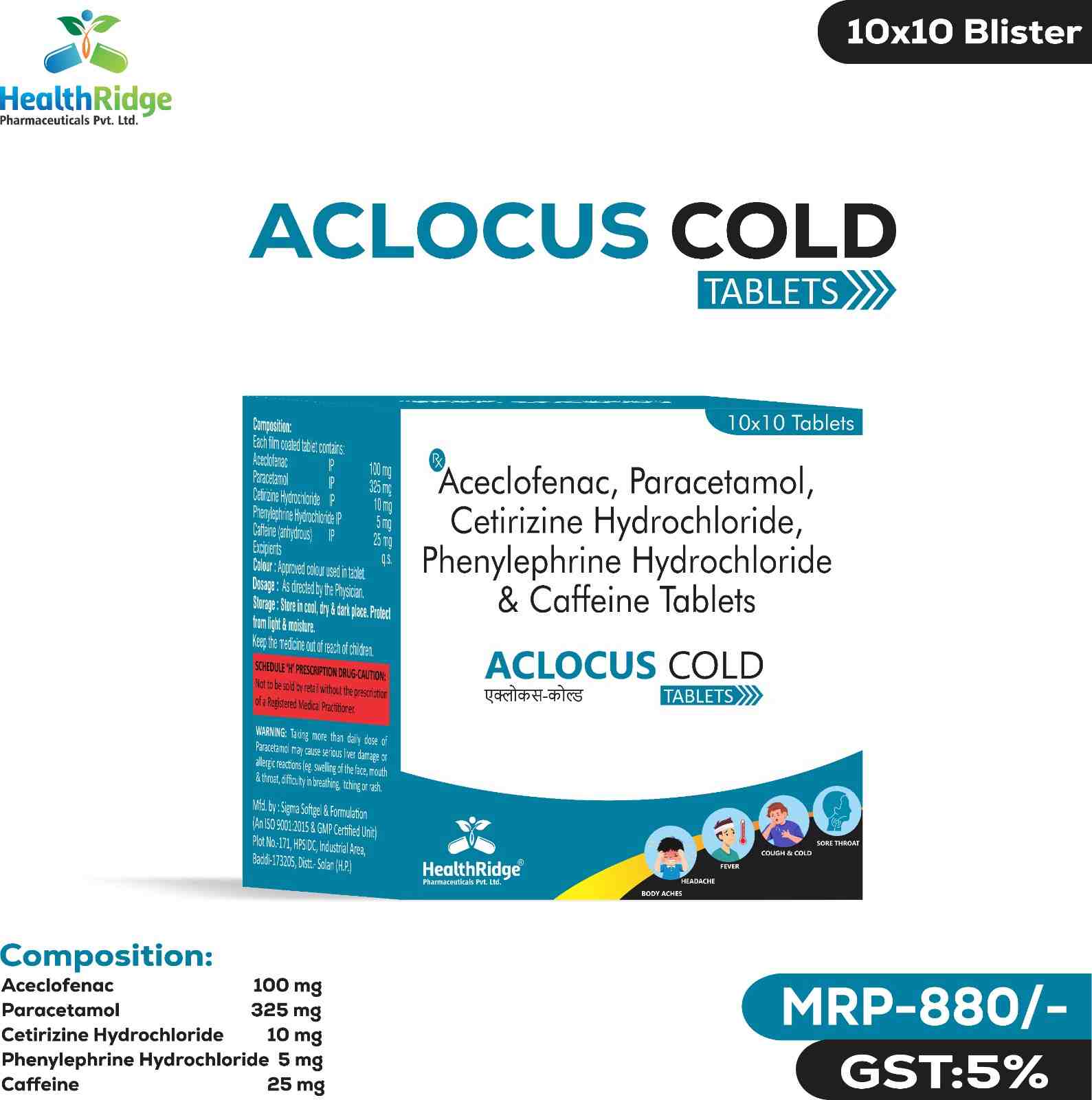 Compostion : Aceclofenac 100mg + Paracetamol 325mg + Cetirizine Hydrochloride 10mg + Phenylephrine Hydrochloride 5mg + Caffeine (Anhydrous) 25mg