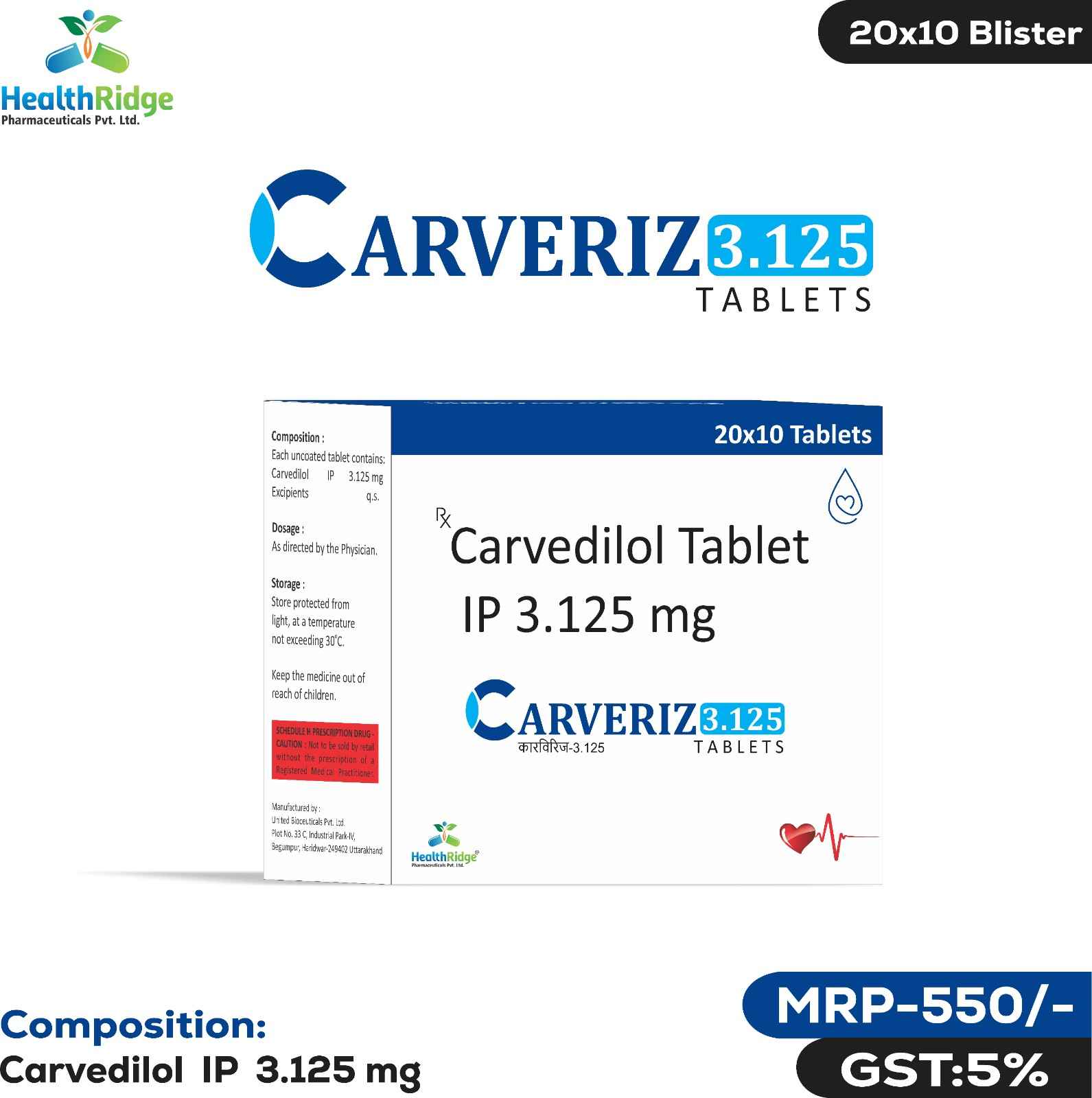 Detail:- Carvedilol Tablets IP 3.125 mg Treat high blood pressure, heart-related chest pain (angina), and heart failure. It works by relaxing the blood vessels, so that blood can flow more easily to the heart. Lowering blood pressure also helps prevent future heart attacks and strokes.