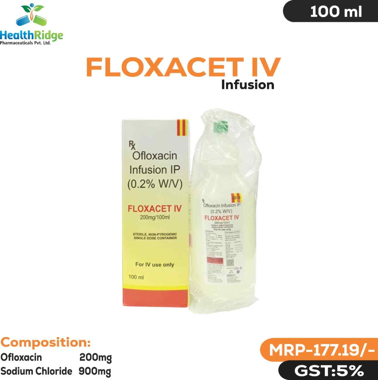 Detail:- Ofloxacin 200mg + Sodium Chloride 900mg Used in the treatment of bacterial infections. It is also used in treating infections of the urinary tract, nose, throat, skin and soft tissues, and lungs (pneumonia).