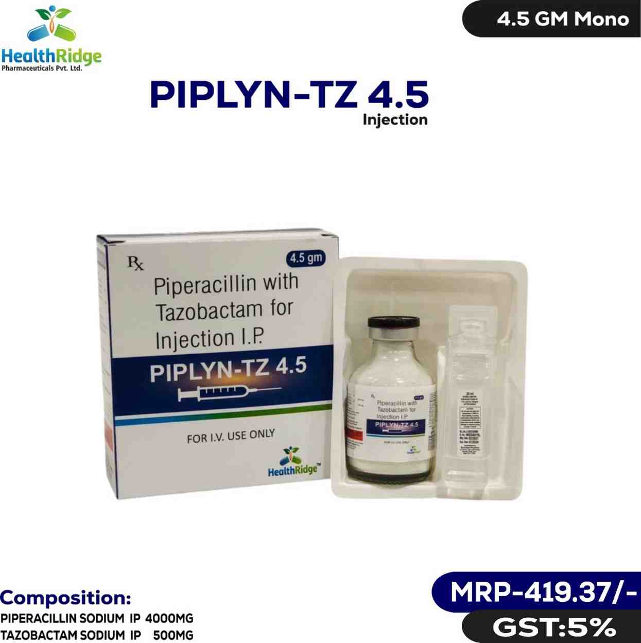 Detail:-PIPERACILLIN SODIUM 4000MG + TAZOBACTAM SODIUM 500MG It works by preventing the formation of the bacterial protective covering which is essential for the survival of bacteria.